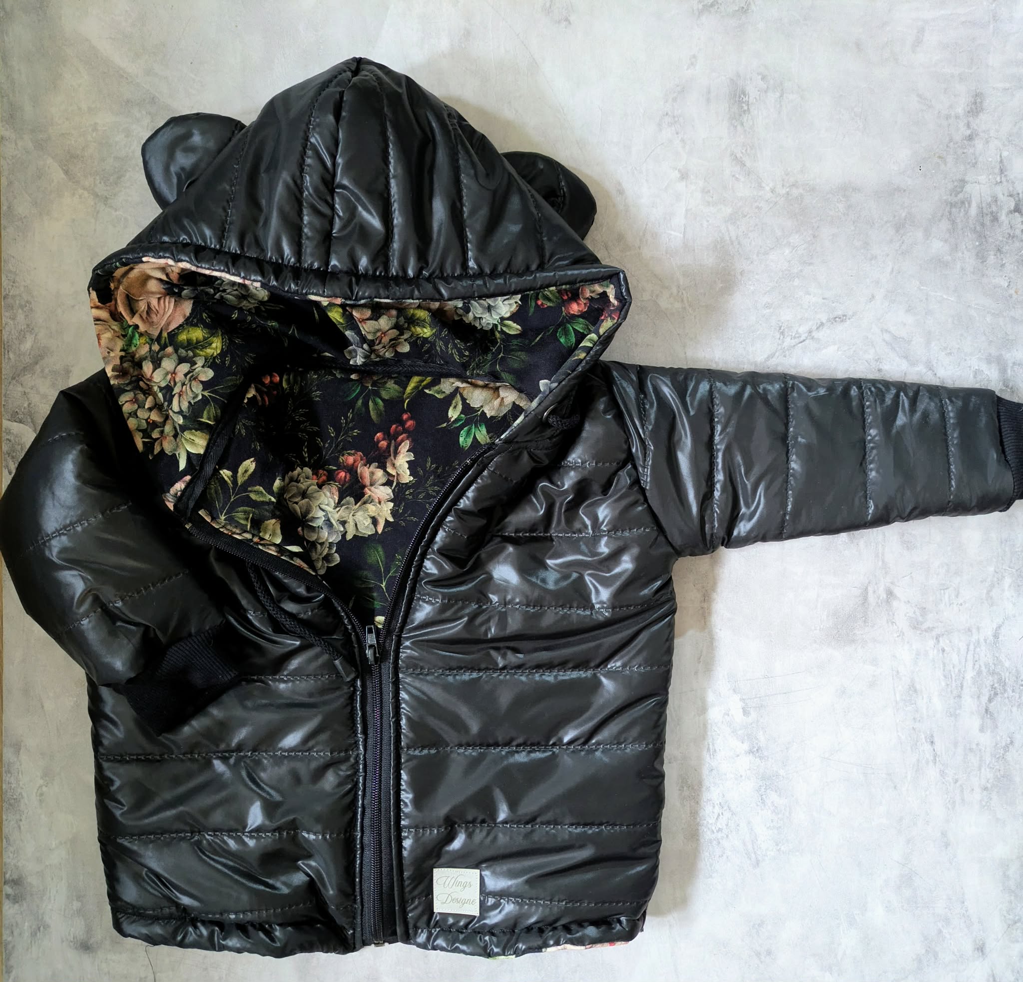 Połączenie czarnych pasów z kwiatowym wzorem sprawia, że kurtka przyciąga uwagę i wyróżnia się spośród innych.